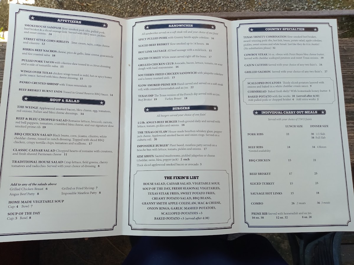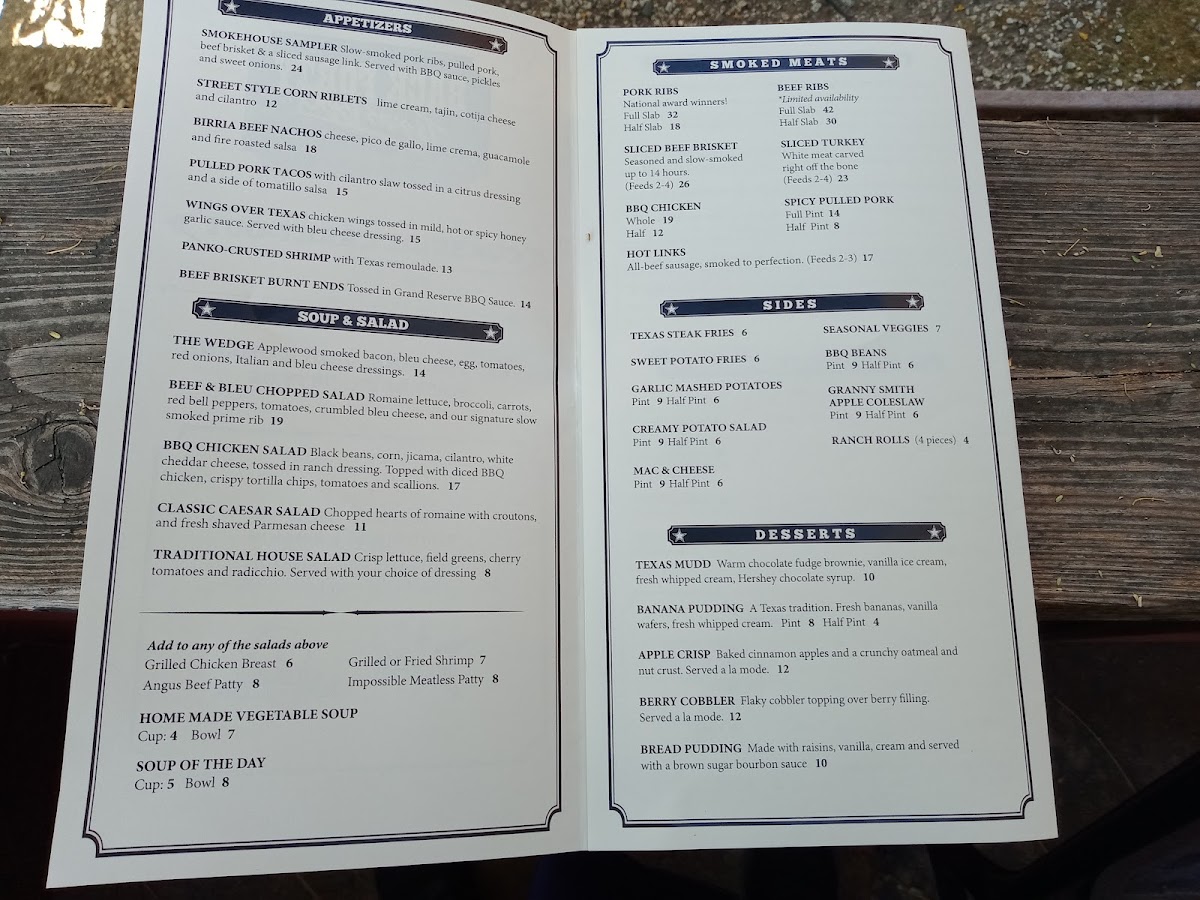This is the kind of menu that fits well with relaxed gatherings, whether it’s a casual weeknight dinner, a weekend hangout with friends, or a special occasion in one of their banquet rooms. The sturdy, filling dishes match the warm, inviting atmosphere of the roadhouse and saloon, encouraging leisurely meals and easy conversation over a cold drink or two. Whether you're stopping in for a quick lunch or settling in for a slower-paced dinner, the menu is designed to offer familiar, satisfying comfort with a Texas twist.